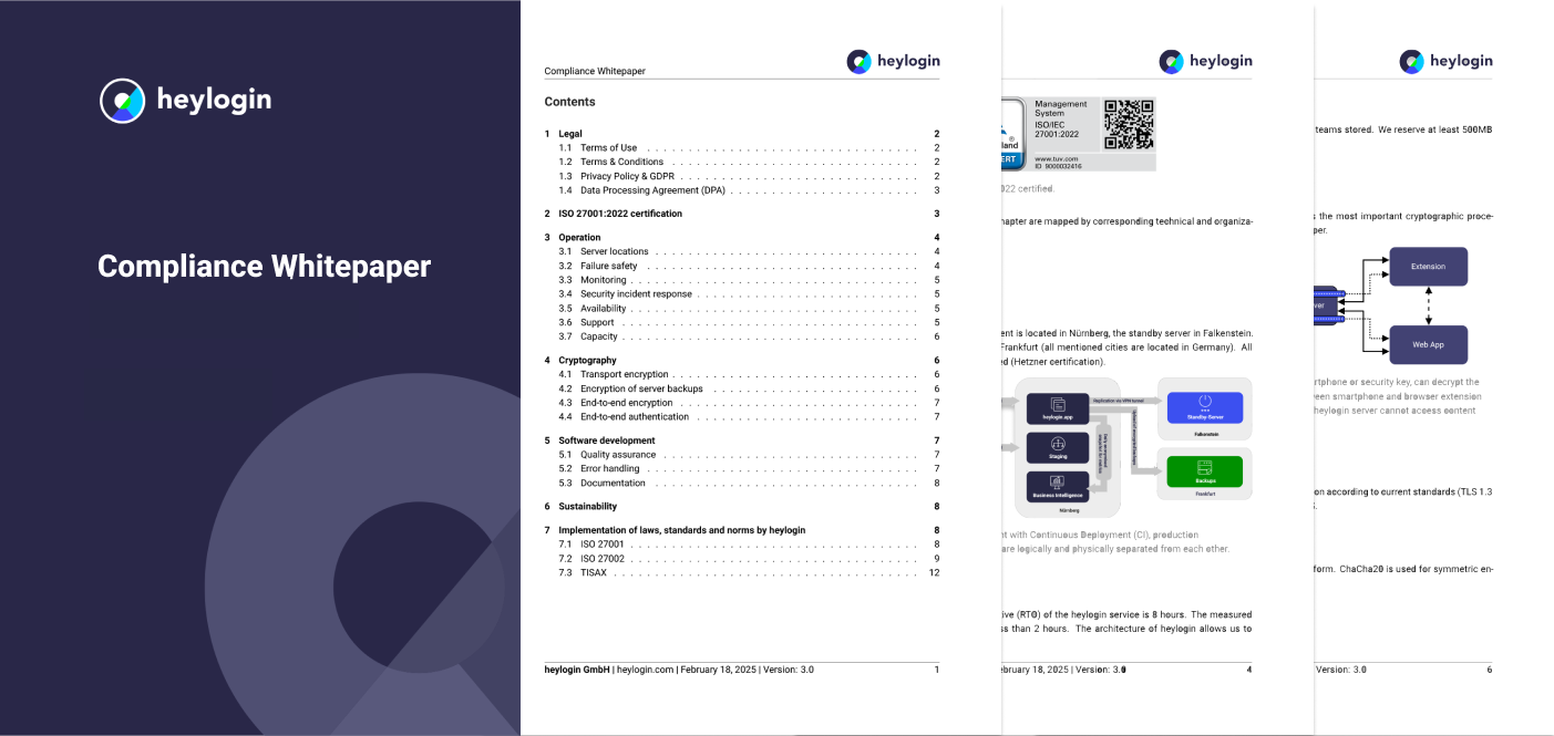 In our Compliance Whitepaper, we explain how heylogin fulfills compliance requirements and can support your company as a technical measure in the implementation of access controls.